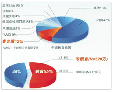青光眼的主要危害是損害視神經(jīng),使患者出現(xiàn)視力下降、視野缺損,患者視線范圍內(nèi)出現(xiàn)盲區(qū),隨著病情的進(jìn)展,黑點(diǎn)范圍不斷擴(kuò)大,最終導(dǎo)致失明。青光眼是全球第2位致盲眼病,僅次于白內(nèi)障。一項(xiàng)國內(nèi)調(diào)查顯示,我國青光眼患者55%致盲,18.1%導(dǎo)致雙眼盲。