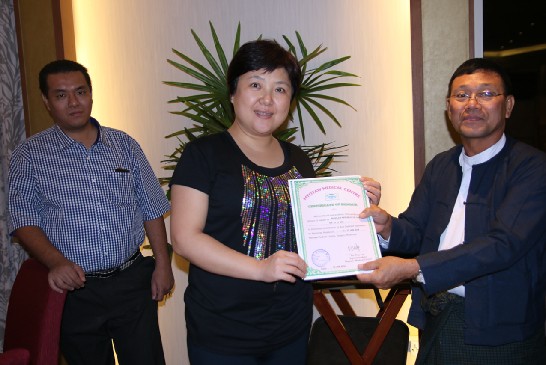 緬甸執(zhí)政黨、緬甸鞏固和發(fā)展黨中央常委、仰光地區(qū)黨部主席、仰光前任市長(zhǎng)U Aung Thein Lin先生向廈門眼科中心李立梅博士頒發(fā)證書