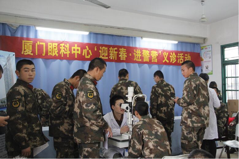 1月29日下午,廈門眼科中心眼表與角膜病專家一行9人冒著冬雨到翔安武警邊防支隊(duì)機(jī)動(dòng)大隊(duì),開展“迎新春 送健康”健康咨詢、義診活動(dòng),并為邊防支隊(duì)武警贈(zèng)送了進(jìn)口眼藥水。廈門眼科中心以實(shí)際行動(dòng)提前為武警邊防支隊(duì)致以新春祝福與問(wèn)候,并送去了健康。義診現(xiàn)場(chǎng)氣氛十分熱烈,義診從下午三點(diǎn)半一直持續(xù)到下午六點(diǎn),為近百名武警做了眼體檢。
