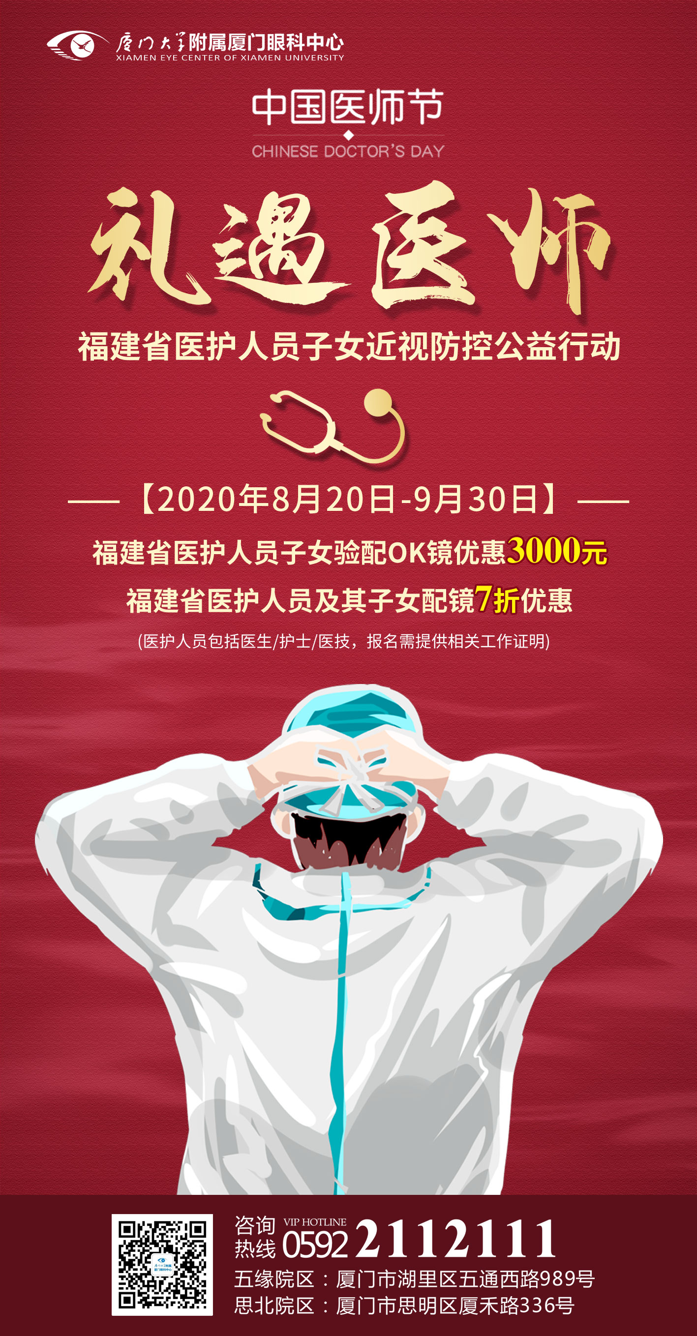 值此醫(yī)師節(jié)到來(lái)之際,廈門市衛(wèi)生健康委員會(huì)、廈門市醫(yī)師協(xié)會(huì)、廈門市衛(wèi)生健康委員會(huì)團(tuán)委聯(lián)合海西晨報(bào)發(fā)出“禮遇醫(yī)師”倡議。為響應(yīng)倡議,廈門大學(xué)附屬?gòu)B門眼科中心特舉辦福建省“禮遇醫(yī)師”醫(yī)護(hù)人員子女近視防控優(yōu)惠活動(dòng)。