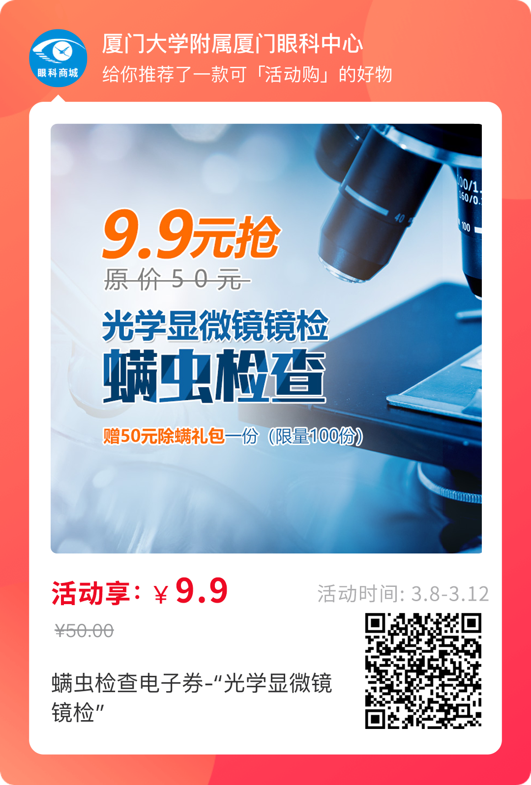 1、活動(dòng)期間,9.9元即可享50元“光學(xué)顯微鏡鏡檢”螨蟲(chóng)檢查;