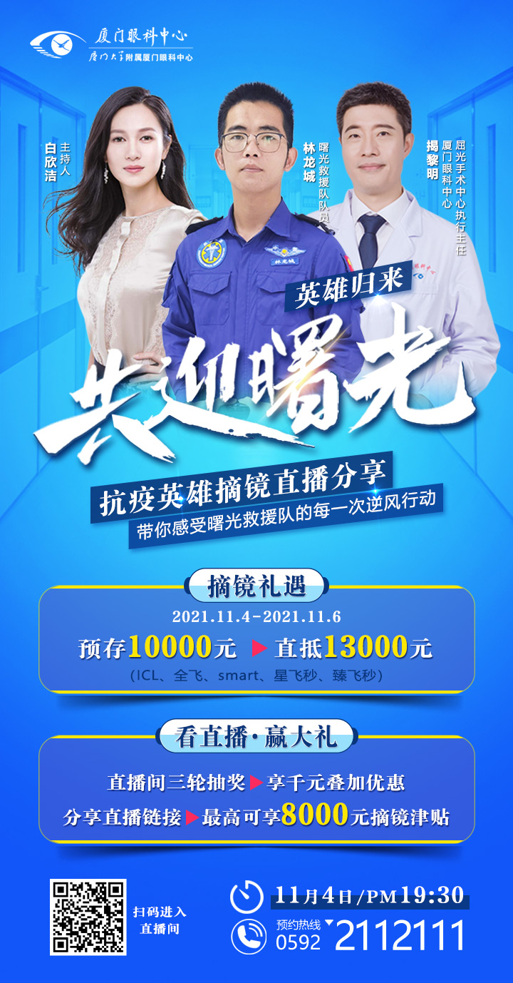 2021年11月1日-11月3日發(fā)布話題#我在廈門眼科中心成功摘鏡啦#+摘鏡自拍照 1 張至 朋友圈 即可獲得幸運禮包:價值300元的術后復查券 1 張( 3次/年 )