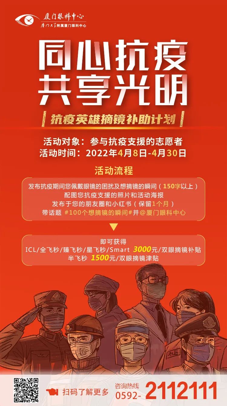 活動(dòng)內(nèi)容 :發(fā)布抗疫期間佩戴眼鏡的困擾及想摘鏡的瞬間(150字以上)發(fā)布于PYQ和小H書(shū)(保留1個(gè)月),配圖您抗疫支援的照片(2 張及以上)和本次活動(dòng)海報(bào),帶上話題#100個(gè)想摘鏡的瞬間,并@廈門(mén)眼科中心,即可獲得摘鏡補(bǔ)貼。