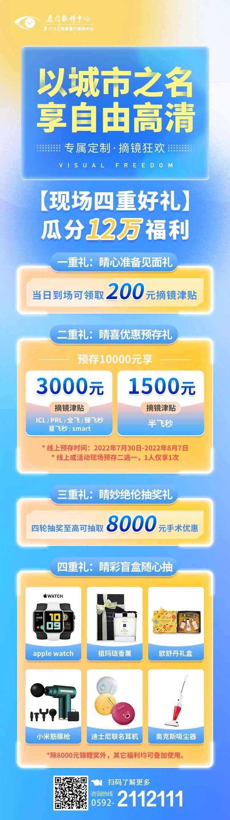 現(xiàn)場預(yù)存10000元,ICL/PRL/全飛秒/臻飛秒/星飛秒/Smart 即享3000元摘鏡津貼;半飛秒享1500元摘貼。