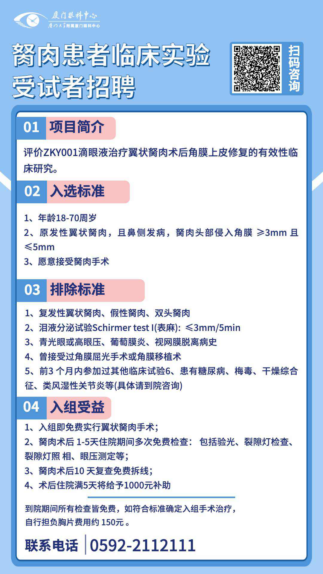 本次研究對受試者的個人信息將嚴格保密,所獲的所有信息將僅作研究分析之用。如果有可能符合以上條件或想了解更多信息的朋友,可以通過以下方式咨詢:0592-2112111