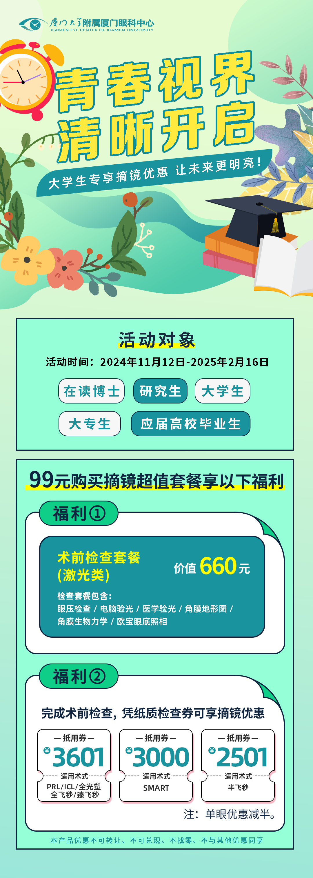 近幾年,大學生做近視手術(shù)已屢見不鮮,在走進大學校園時或剛剛畢業(yè)準備就業(yè)時選擇做近視手術(shù)仿佛已經(jīng)成為一種“風尚”。那么身為“大學生”群體中的一員,做近視手術(shù)會不會有優(yōu)惠呢?近期不少福建大學生都在后臺留言。一起來看看吧!