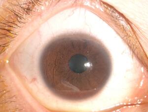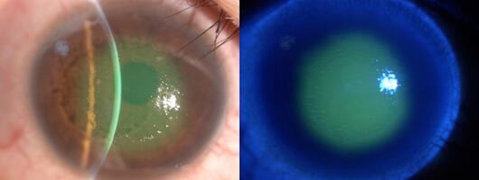 王女士回家后趕緊滴了眼藥水,未想第二天右眼疼痛更加明顯,已無法正常睜眼,視力也降到只有眼前手動。這下王女士慌了神,決定還是到正規(guī)專科醫(yī)院看病為好,經(jīng)人介紹,王女士來到廈門眼科中心找到修陽暉博士就診。經(jīng)過詳細(xì)的檢查后,修陽暉博士發(fā)現(xiàn)王女士患上了嚴(yán)重的角膜炎,中央?yún)^(qū)角膜已大部分受綠膿桿菌感染及浸潤。