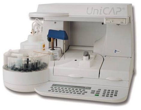 UniCAP系統(tǒng)建立于新型固體——ImmunoCAP上。ImmunoCAP是裝在小膠囊中的親水性載體聚合物,由一種經(jīng)CNBr活化的纖維素衍生物合成,有變應(yīng)原結(jié)合的能力。其優(yōu)良的反應(yīng)條件和較短的擴(kuò)散距離,使過敏原的檢出率較以往方法提高15%。來自美國、歐洲和亞太地區(qū)的臨床結(jié)果說明,與獨(dú)立的皮試結(jié)果相比,UniCAP系統(tǒng)得出的結(jié)果與變態(tài)反應(yīng)專家的臨床診斷有更好的相關(guān)性。