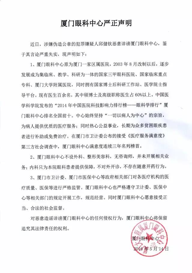 近日,涉嫌偽造公章的犯罪嫌疑人邱健欽惡意攻擊誹謗廈門眼科中心,鑒于其言論嚴(yán)重失實(shí),現(xiàn)聲明如下: