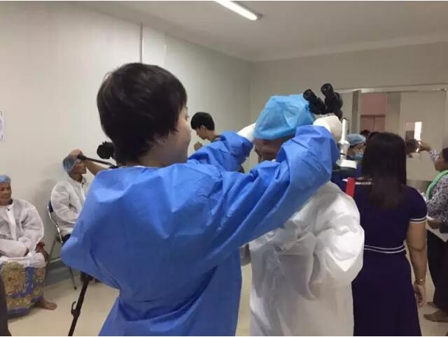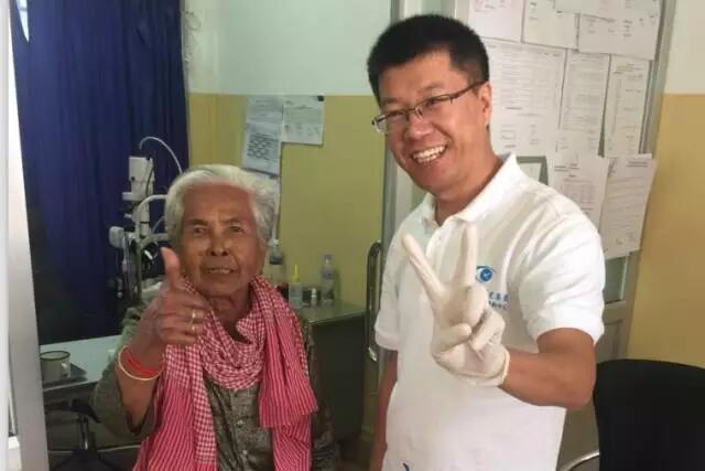 這個(gè)情況被手術(shù)結(jié)束出來取晶體的護(hù)士看到了,她報(bào)告給了醫(yī)療隊(duì)隊(duì)長(zhǎng)李立梅博士,李博士聽到后立刻走出手術(shù)室來到老人身旁,握起老人的手親切問到:“奶奶,你怎么了?是哪里不舒服嗎?”老人用弱小地聲音結(jié)結(jié)巴巴地回答了一堆柬語(yǔ),經(jīng)過翻譯翻譯后才知道,老人是因?yàn)楹ε率中g(shù)心里緊張,再加上手術(shù)室的冷氣才發(fā)抖的。