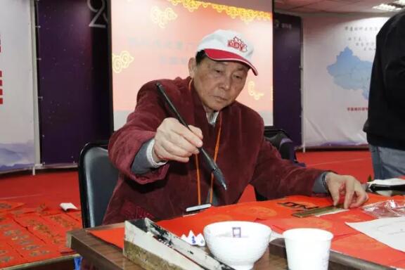 患友站在書法家對(duì)面,做幫手。小心翼翼地按住紅紙的一頭,在其寫完一字起筆蘸墨的瞬間,輕輕拉過(guò)一格,讓他寫第二個(gè)字。