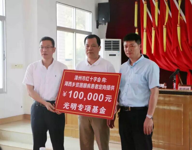 當天的活動現(xiàn)場,廈門眼科中心和漳州市紅十會一起為湖西鄉(xiāng)貧困眼疾患者捐贈了10萬元的“光明專項基金”。