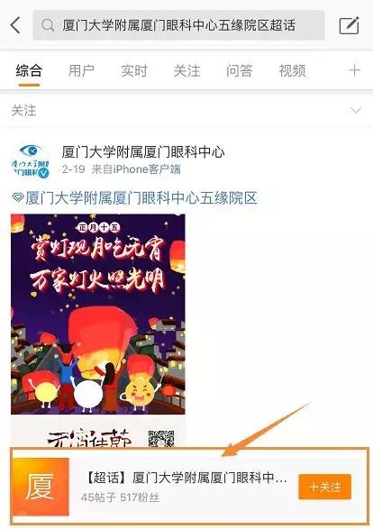 ?、俅蜷_新浪微博,點擊“發(fā)現(xiàn)”,搜索“廈門大學附屬廈門眼科中心五緣院區(qū)”;