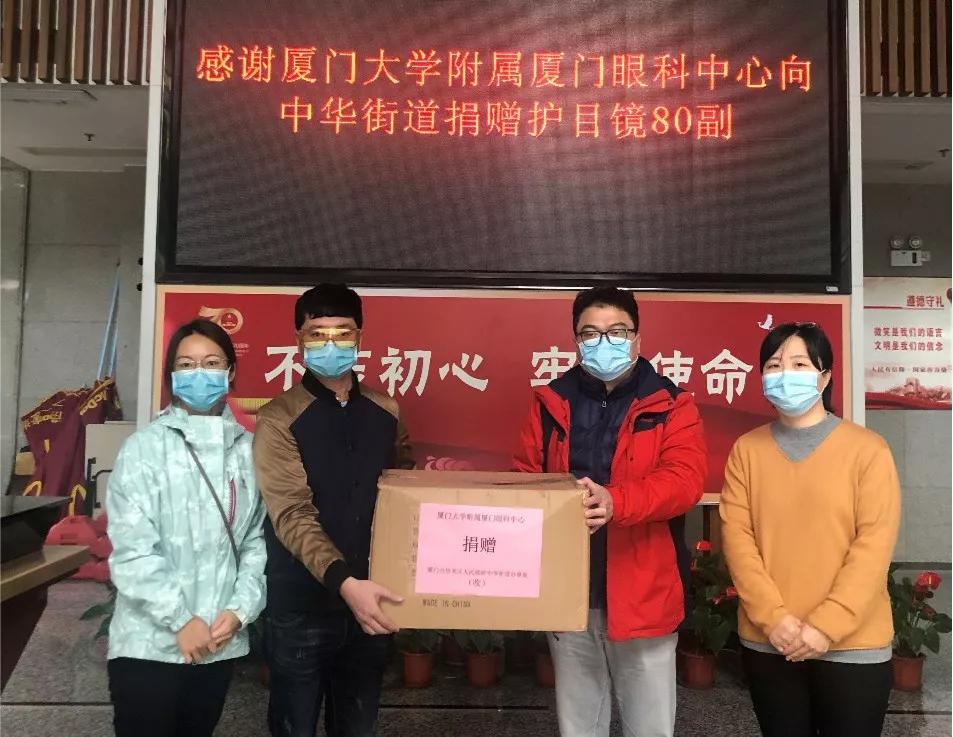 “主任您好,你們辛苦了。這是我們廈門大學(xué)附屬廈門眼科中心捐贈的護目鏡,請您代表貴街道接收。相信我們會戰(zhàn)勝疫情,迎來美好的春天!”