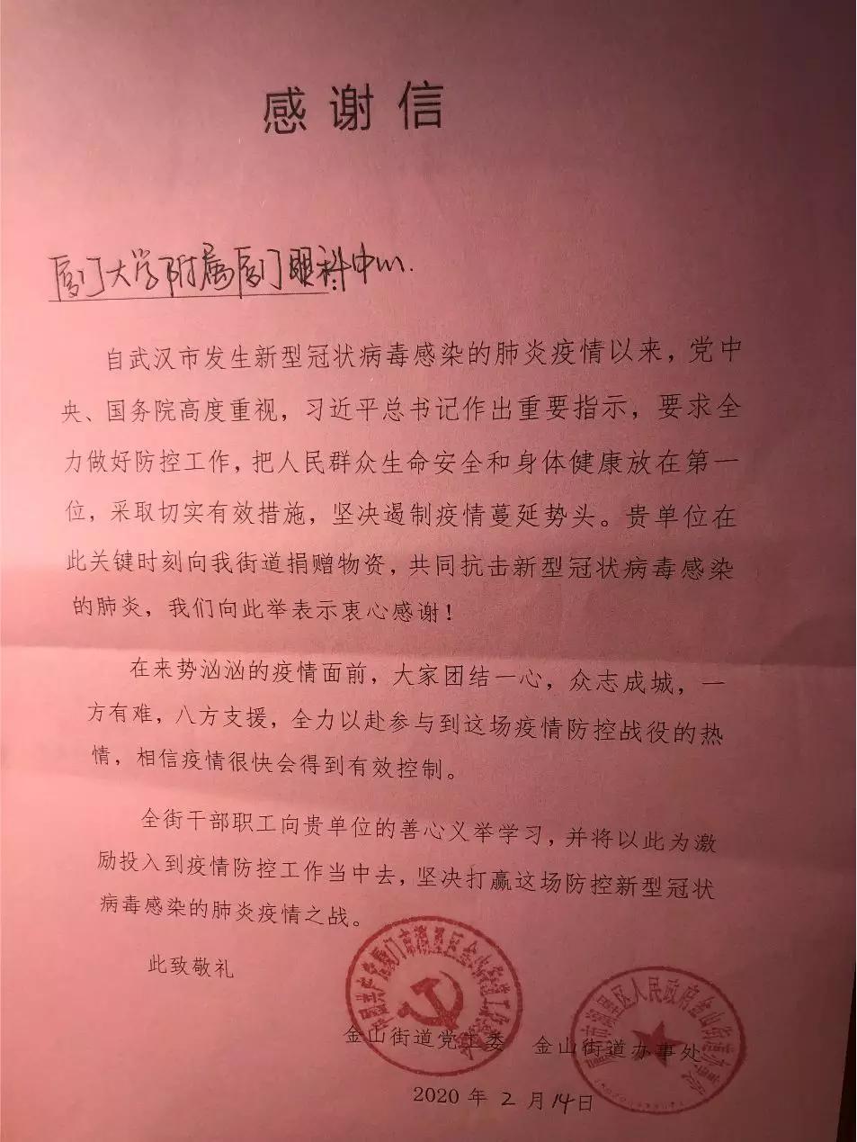 在中華街道辦,街道在LED大屏上打上了“感謝廈門大學(xué)附屬廈門眼科中心向中華街道捐贈護目鏡”;廈港街道辦為醫(yī)院頒發(fā)了榮譽證書;還有湖里街道辦、金山街道辦等街道也寫了一封封誠摯的感謝信。