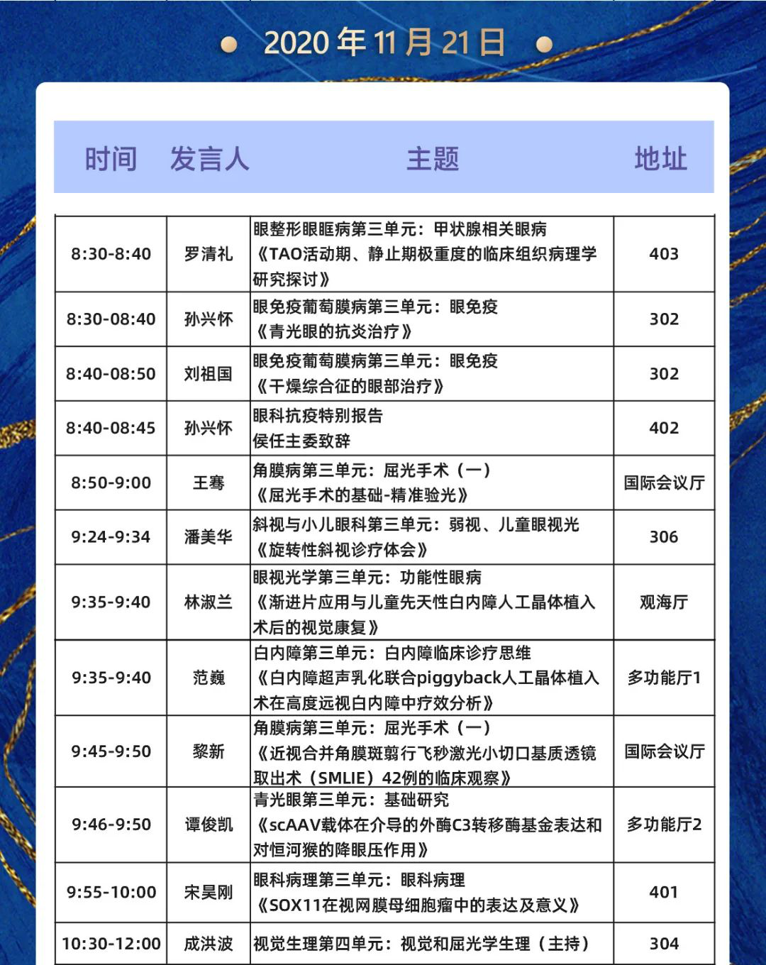 2020年11月19日-11月22日,中華醫(yī)學(xué)會(huì)二十五次全國眼科學(xué)術(shù)會(huì)議將在廈門國際會(huì)展中心舉行。根據(jù)抗疫工作的特殊情況,大會(huì)采取線上線下結(jié)合的方式舉行,并縮減了線下參會(huì)人數(shù),但大會(huì)的學(xué)術(shù)內(nèi)容仍一如既往地豐富和精彩。