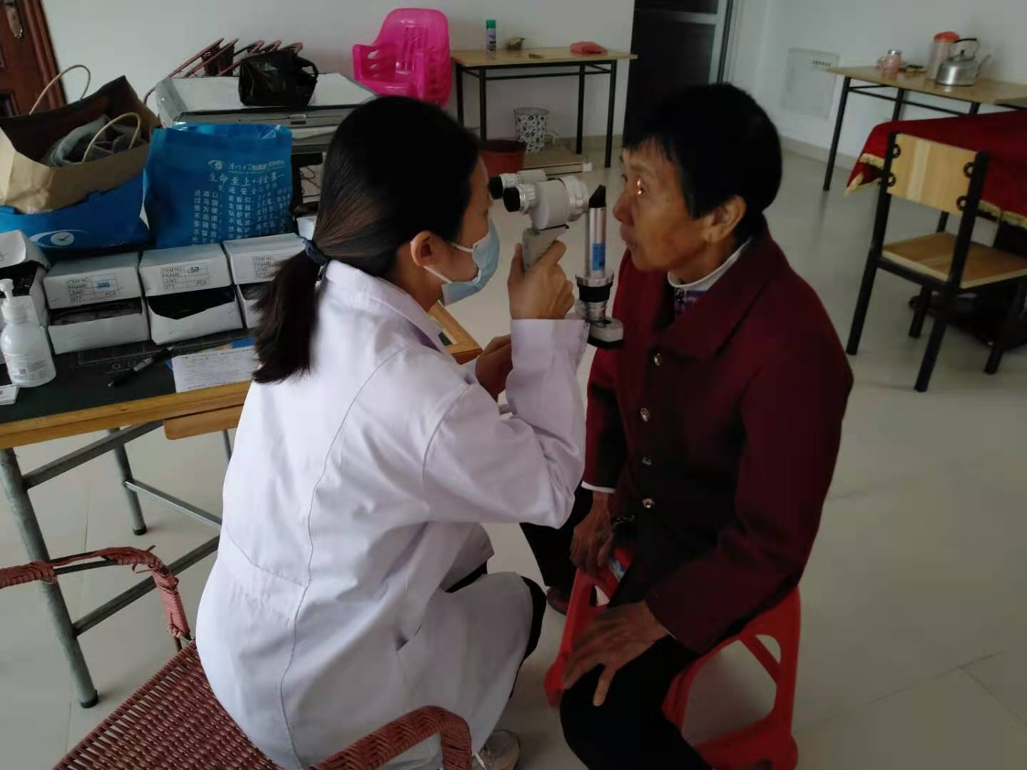 剛從田里回來(lái)的李奶奶,一大早就搬著小板凳,等著醫(yī)生做檢查。
