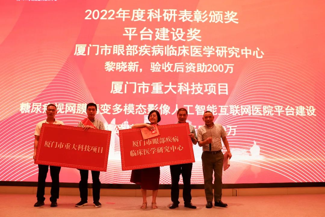 會(huì)上,2022年度科研表彰頒獎(jiǎng)盛典同步舉行。2022年度,我院科研工作再結(jié)碩果,醫(yī)院學(xué)術(shù)品牌的影響力和號(hào)召力得到進(jìn)一步提升。我院獲批成為廈門(mén)市眼部疾病臨床醫(yī)學(xué)研究中心,榮登2022年度中國(guó)醫(yī)院科技量值(眼科學(xué))榜單,并連續(xù)十年衛(wèi)冕福建省眼科學(xué)第 一,實(shí)力領(lǐng)跑。