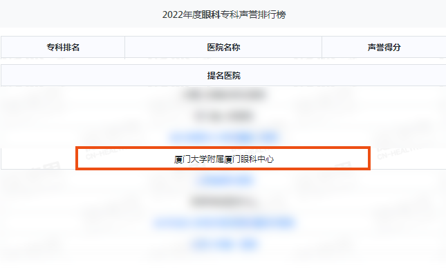 11月25日,由國(guó)內(nèi)著名同行專(zhuān)家擔(dān)任評(píng)審的復(fù)旦版《2022年度中國(guó)醫(yī)院綜合排行榜》和復(fù)旦版《2022年度中國(guó)醫(yī)院專(zhuān)科聲譽(yù)排行榜》在上海市發(fā)布。廈門(mén)眼科中心榮獲2022年度眼科專(zhuān)科聲譽(yù)排行榜提名,是全福建省唯一上榜的專(zhuān)科醫(yī)院,且已經(jīng)是廈門(mén)眼科中心連續(xù)第五年上榜!