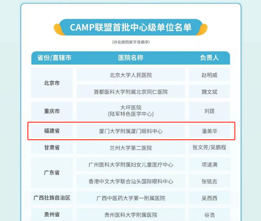 CAMP由國(guó)家眼部疾病臨床醫(yī)學(xué)研究中心牽頭組建,在健康中國(guó)戰(zhàn)略和近視防控政策的指引下,以持續(xù)提升基層眼健康服務(wù)能力為核心,旨在通過(guò)整合眼科醫(yī)療資源、科研力量和臨床經(jīng)驗(yàn),聚力構(gòu)建一個(gè)高效、協(xié)同、創(chuàng)新的近視防控服務(wù)體系和覆蓋全國(guó)的眼健康醫(yī)療服務(wù)網(wǎng)絡(luò)。聯(lián)盟啟動(dòng)報(bào)名后,共有來(lái)自29個(gè)省和直轄市的434家醫(yī)療機(jī)構(gòu)報(bào)名,其中報(bào)名參選中心級(jí)單位的有108家,最終遴選出首批中心級(jí)單位33家。此次廈門(mén)大學(xué)附屬?gòu)B門(mén)眼科中心成功獲選為中心級(jí)單位,標(biāo)志著醫(yī)院在國(guó)內(nèi)眼科領(lǐng)域尤其是近視防控領(lǐng)域具有顯著的影響力和專(zhuān)業(yè)能力,是聯(lián)盟推進(jìn)近視防控工作的重要力量。