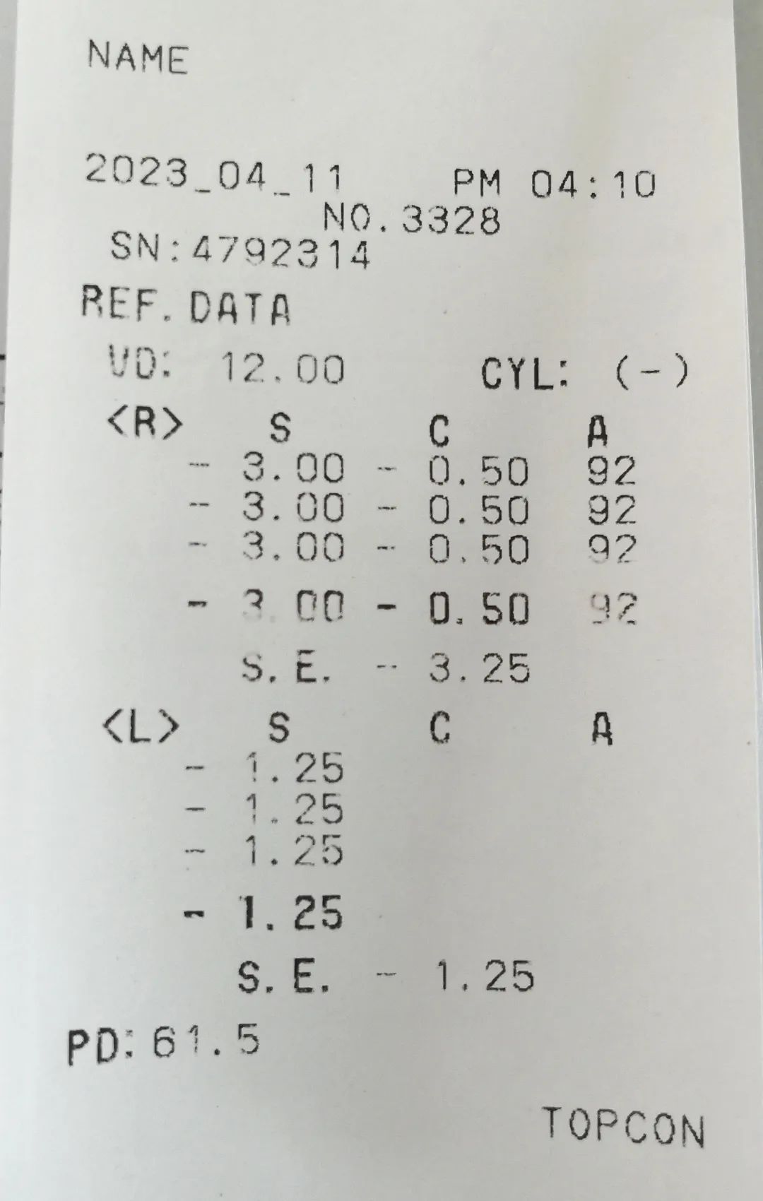 以上面這張圖的右眼數(shù)據(jù)為例:右眼300度近視,50度散光,散光軸位92,兩眼瞳距61.5mm。