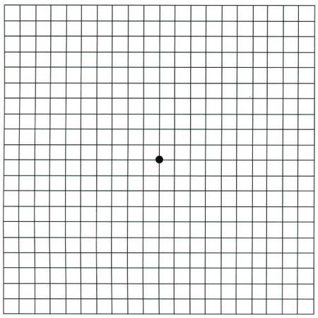有一種簡單且能夠及早發(fā)現(xiàn)老年性黃斑變性的方法,叫做阿姆斯勒方格(如下圖)。這是一個打印的正方形的小格子,類似于棋盤格,尺寸一般是15厘米X15厘米?;颊呖梢园阉N在冰箱上,每隔一周擋住一側眼睛看一看,如果發(fā)現(xiàn)自己任何一側的眼睛看到格子變形了,就需要來看醫(yī)生了。